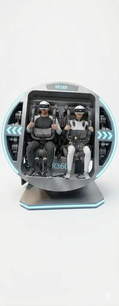 The VR 360° Double brings synchronized dual-player immersive motion experience. 👥 Designed for shared gameplay and social engagement, this simulator increases ticket sales by allowing two players simultaneously. 🎟️ It combines powerful motion dynamics with compact space efficiency for commercial entertainment venues. ⚙️